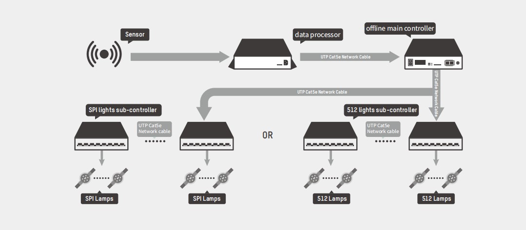 speed, temperature, Pm2.5, etc., analyze it through the intelligent algorithm developed by YD Corporation, and upload the data to the cloud to realize real-time monitoring of the environment; You can also control the content of light animation in real time according to the analysis results.